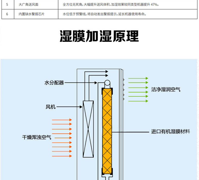 3、涡轮风扇、大循环风、加湿效率高
