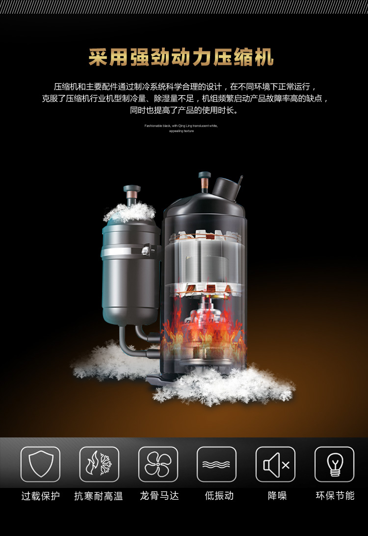 5、采用国际名牌压缩机,动力强劲,强力除湿